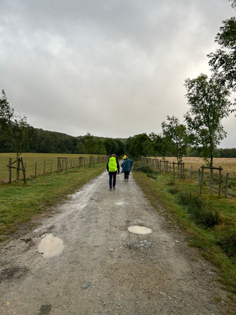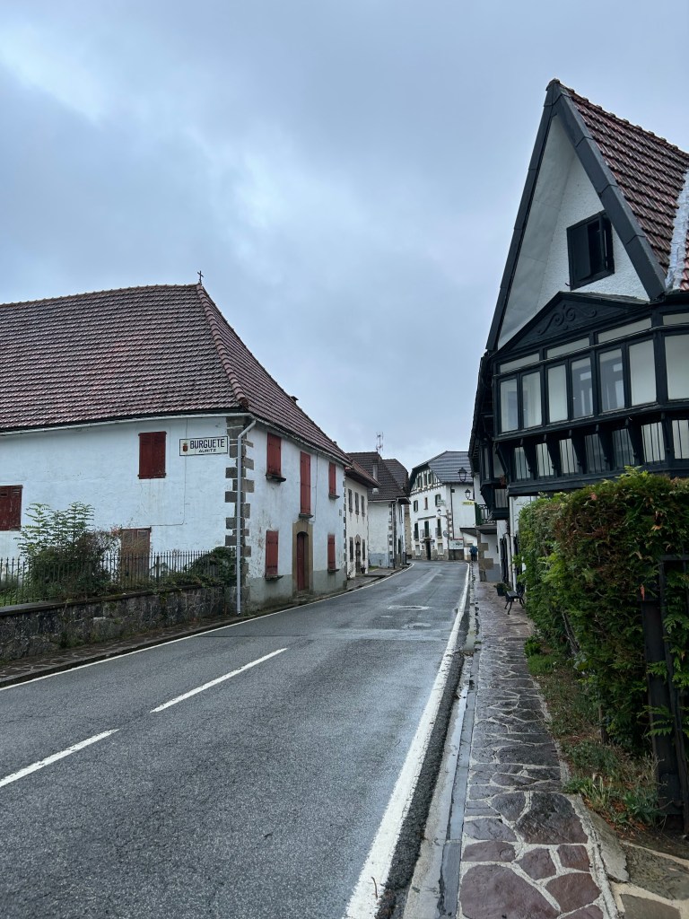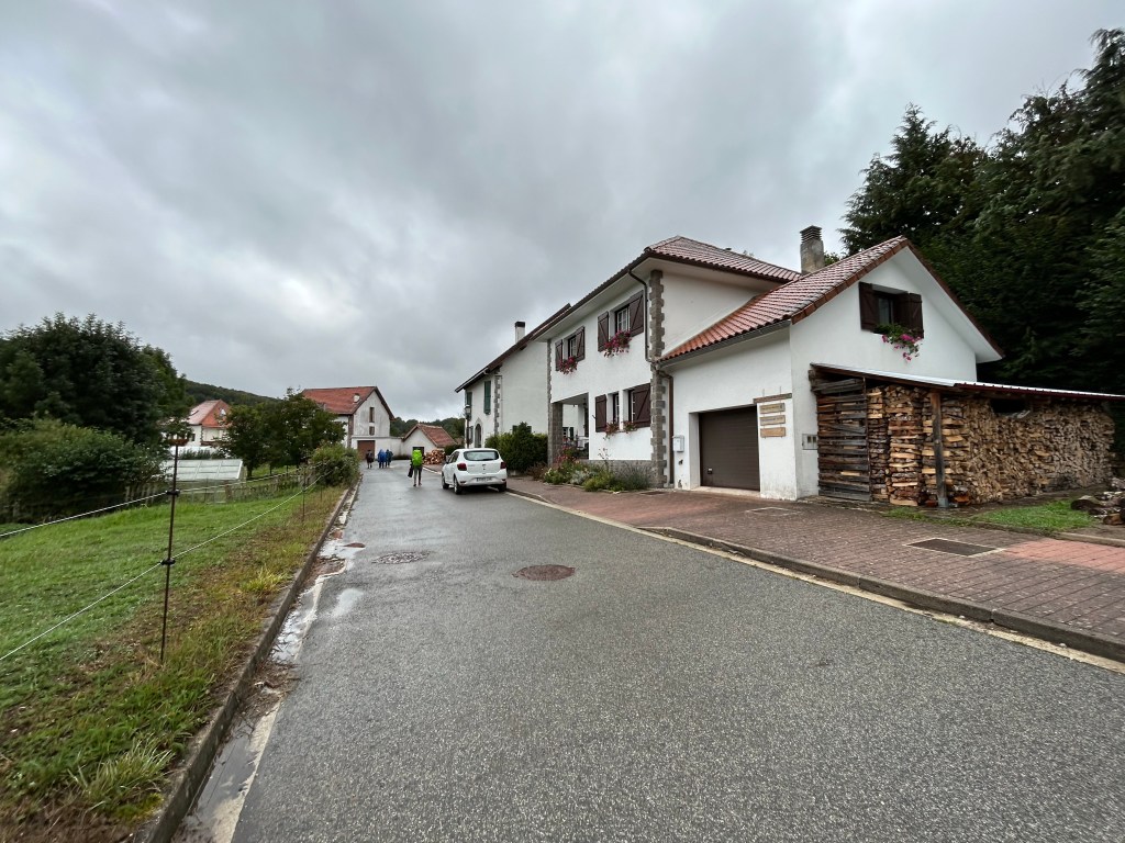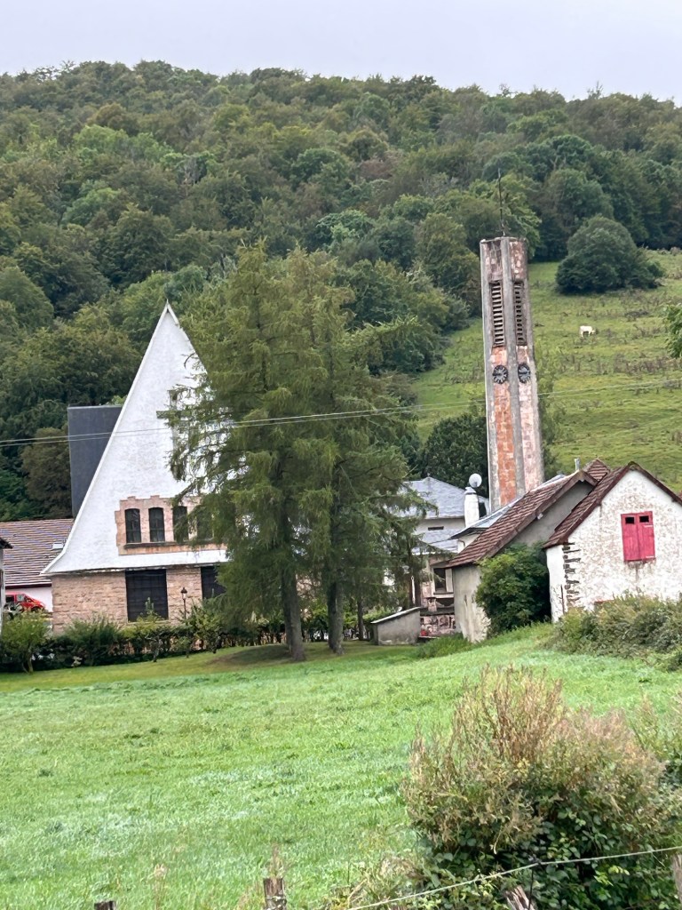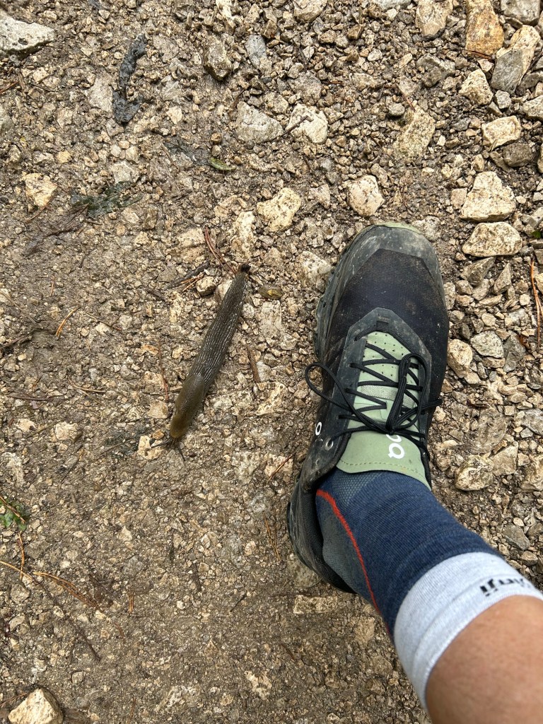 The paths varied from paved road, to wooded forest trails to narrow passages through the fields. Still some misty rain but also stretches of sunshine which brought out all the colors of the villages and forests. Have also been amazed at some of the snails/slugs. This dark one and many orange ones are allover in the wet detris of the forests. For reference, that’s my size 10 next to the dark colored slug!
