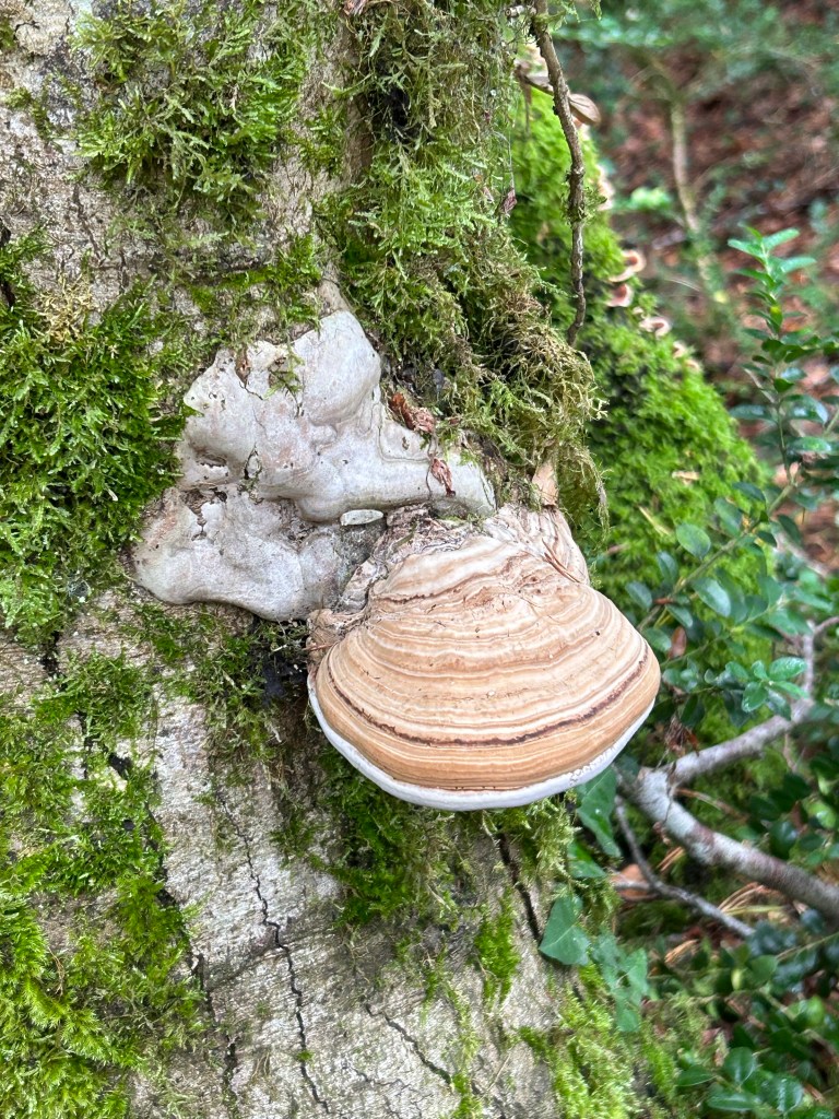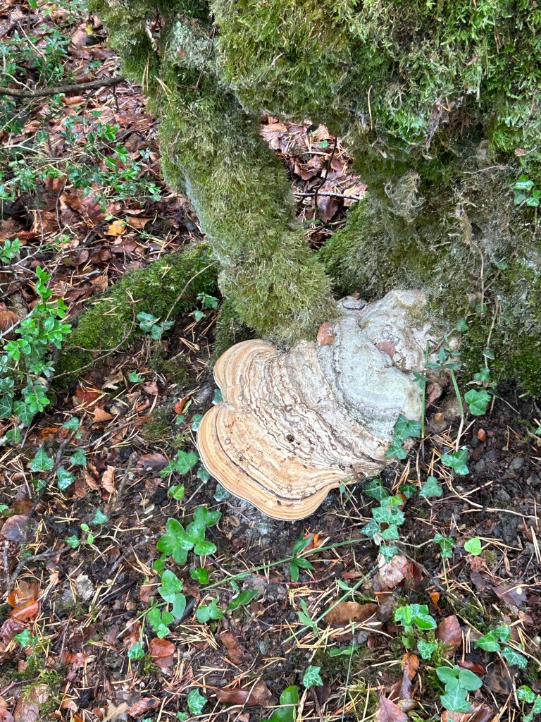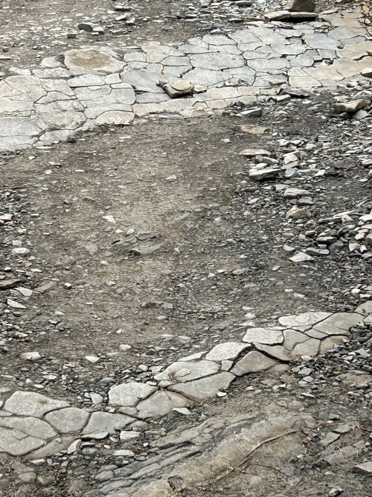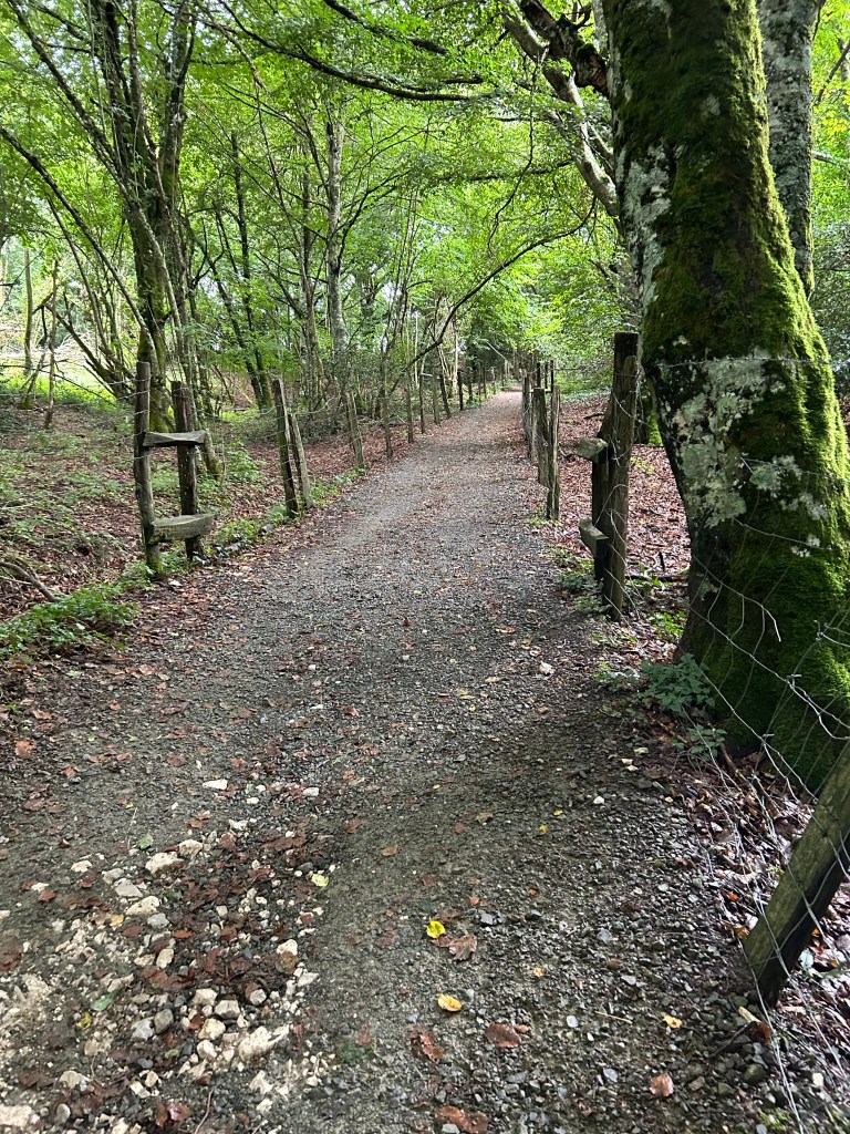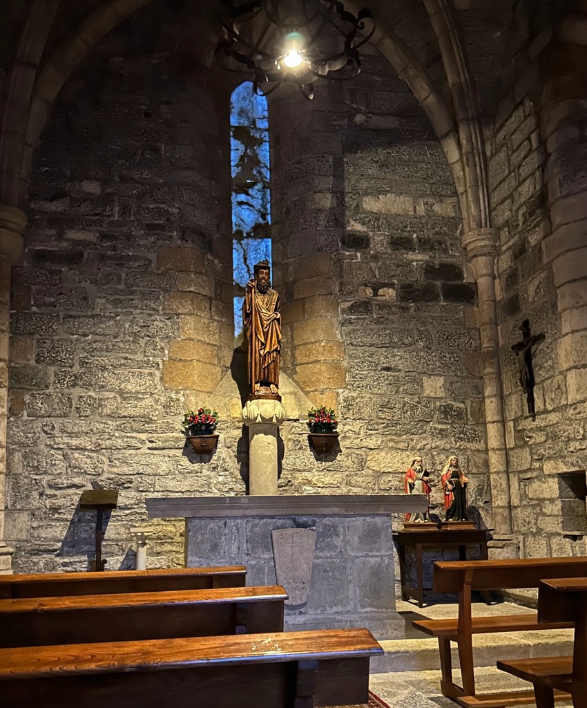 The paths varied from paved road, to wooded forest trails to narrow passages through the fields. Still some misty rain but also stretches of sunshine which brought out all the colors of the villages and forests. Have also been amazed at some of the snails/slugs. This dark one and many orange ones are allover in the wet detris of the forests. For reference, that’s my size 10 next to the dark colored slug!