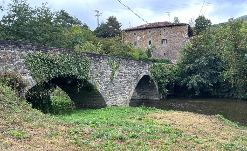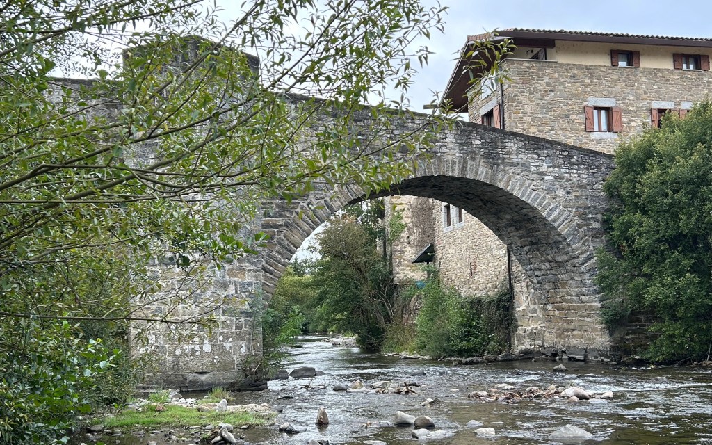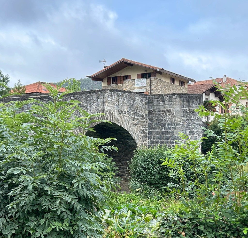 The planned stages of the Camino Frances usually end day 2 in Zubiri. I had hoped to get to Pamplona today (end of Day 3). It was only 11:45 when I came down the hill to Zubiri so I pushed on after taking the photos of La Rabia Bridge. My feet had other thoughts and so about 2 miles out of Zubiri, I stopped and had my picnic. I also have the feet a break and removed my socks while I started looking for rooms within the next hour or two’s walk. My Albergue San Nicolas had a bed. Is a great choice ran by a you g Spanish couple. Coincidence would have it that 3 of the people I ate dinner with last night just arrived! The ladies from Denmark who I enjoyed talking with. Also, three of the last people I encountered throughout the day. I am enjoying walking alone but is nice to see familiar faces while relaxing and thinking of dinner tonight!