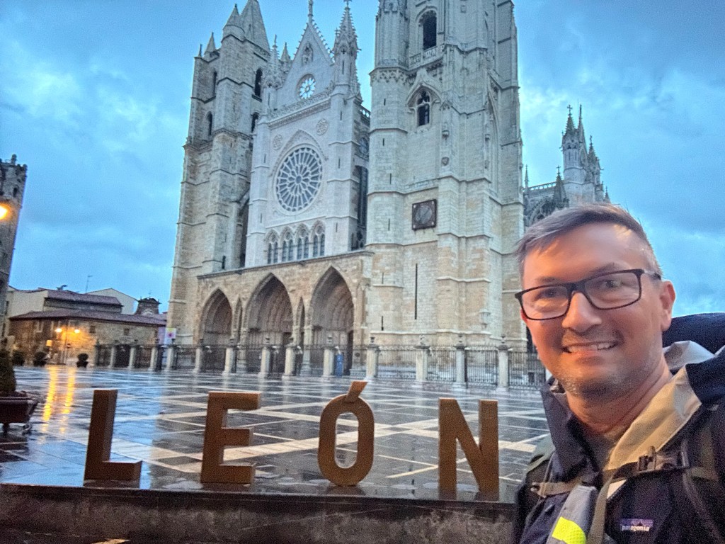 After two days of rest, i was up early and ready to get back out on the walk again! Thankful that the weather forecast had improved and so instead of all day downpours, it was off and on mist as I headed out of Leon. Stopped by the Leon Cathedral to ask for guidance and to pick up the route markings about 7:30. Was lucky in that it really never rained for the first couple hours as we left Leon and suburbs. Was glad for this as most of the path was sidewalks in the urban neighborhoods and there was lots of traffic as the Spanish returned to work on a Monday morning.