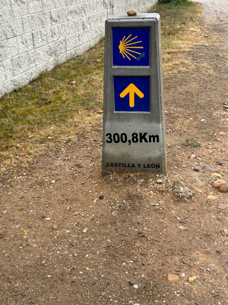 I have been curious about who upkeeps the Camino trail(s). There is great variety in the surfaces and directional signage. Everything from dirt paths, cinder paths, concrete sidewalks or mulch covered dirt is what we walk on and the signage varies from ones like the mileage marker (above) to the yellow shell spines on a blue background to a simple yellow arrow painted on the ground, wall, trees, buildings or sidewalk. Businesses and residences have tiles of the blue and yellow shell on their property. Today there were several sculptures of the ancient pilgrims as well decorating the way.