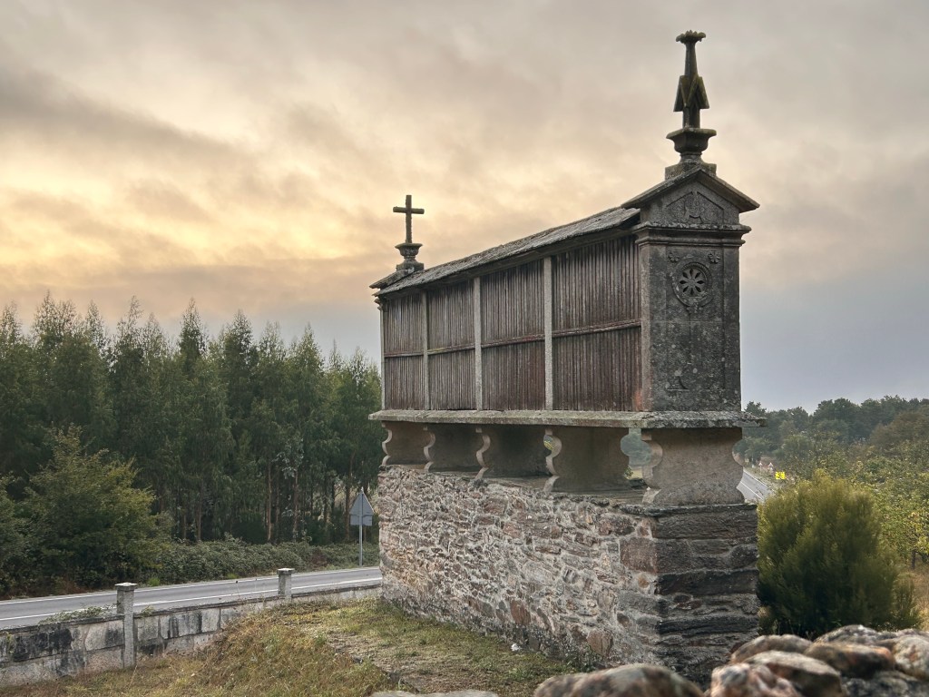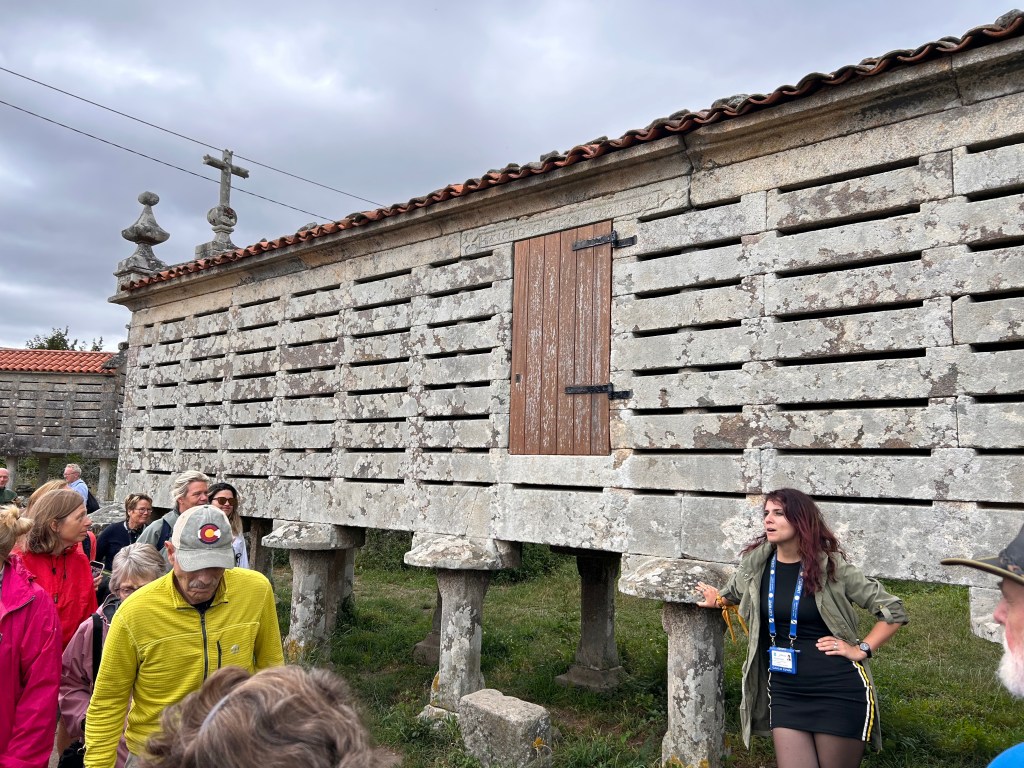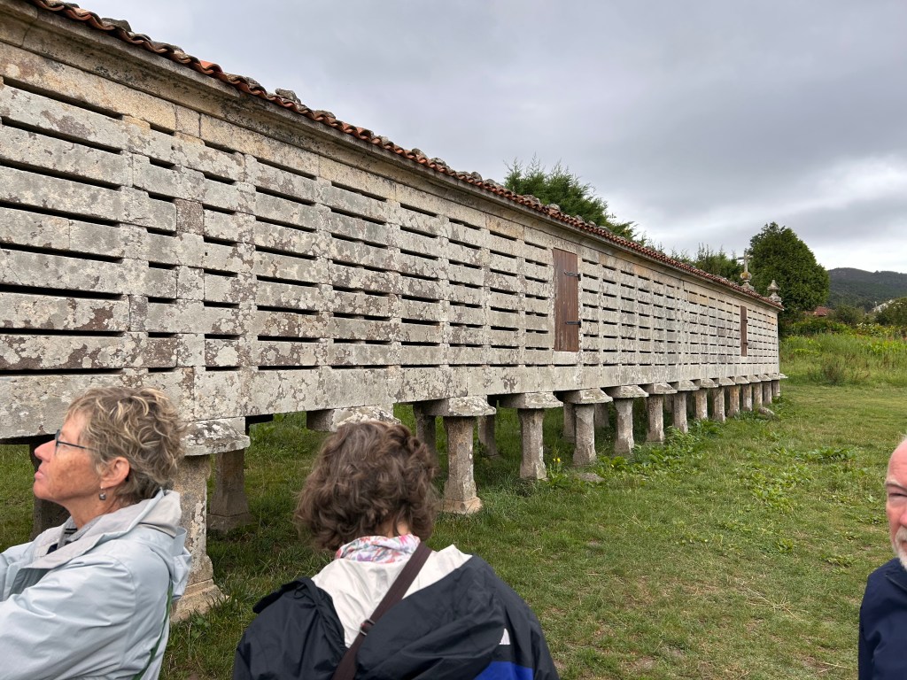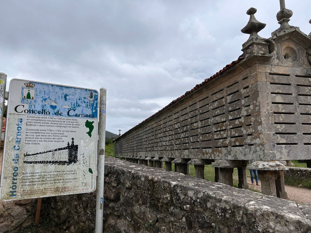 Another structure I have been admiring along the way in Galicia appeared to be a storage facility like an American farm silo. Today I finally learned they are called “Horreo”. They are, in fact, meant for storage of a variety of products-grains, meats, vegetables. Their unique design allows air to flow through but rain not to as the spaces for air are actually tilted inside so rain cant blow in. The large circular shape under the main structure but on top of the posts is purposely designed as rats and other intruders could climb the poles but not hang on upside down. A typical family might have a Horreo with 2 spaces between posts (or 3 sets of legs). In the town of Carnota, the Horreo is famous as the largest one in Galicia. It has 18 spaces. Not for a large family however, it belonged to the church!